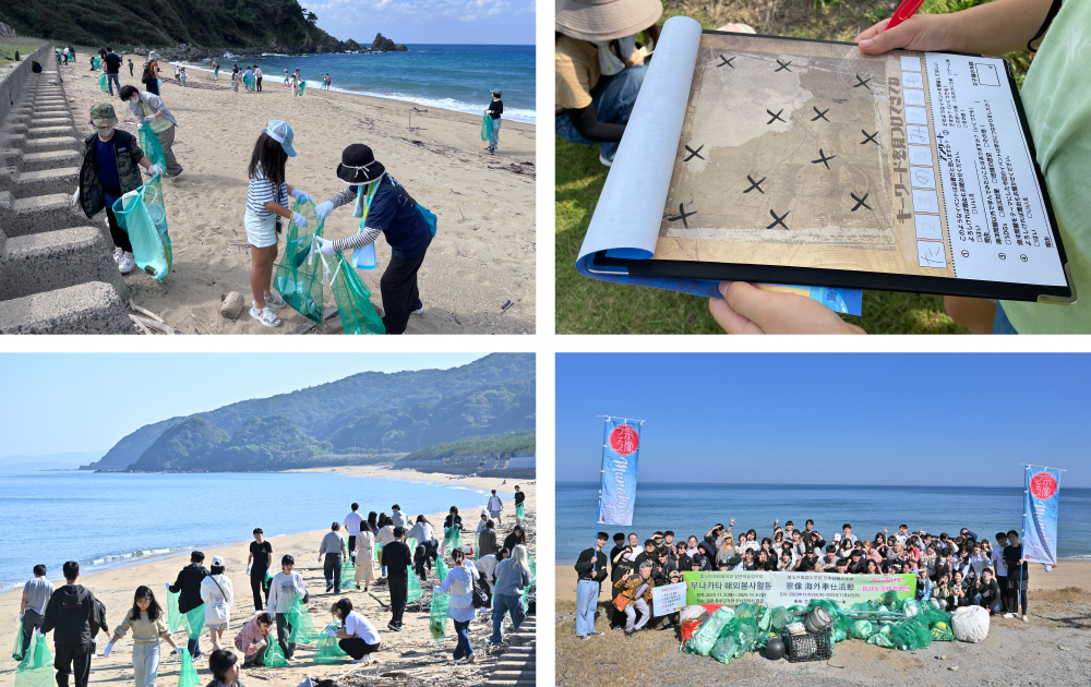 日韓同時海岸清掃として韓国の学生と日本の学生で宗像市海岸清掃活動